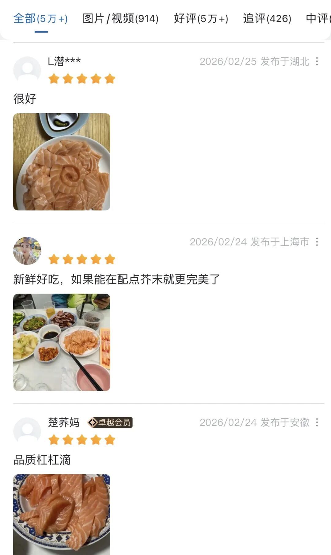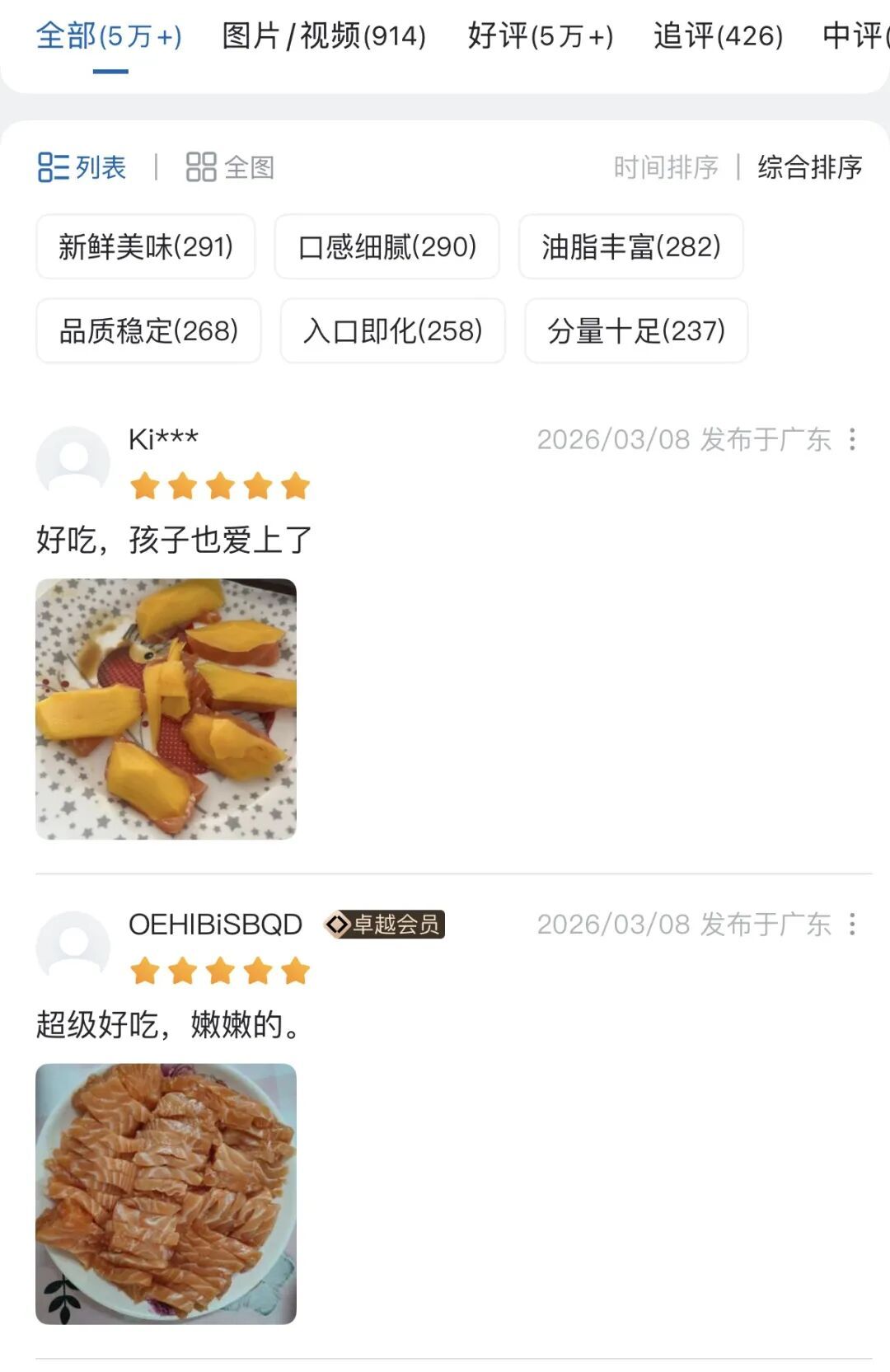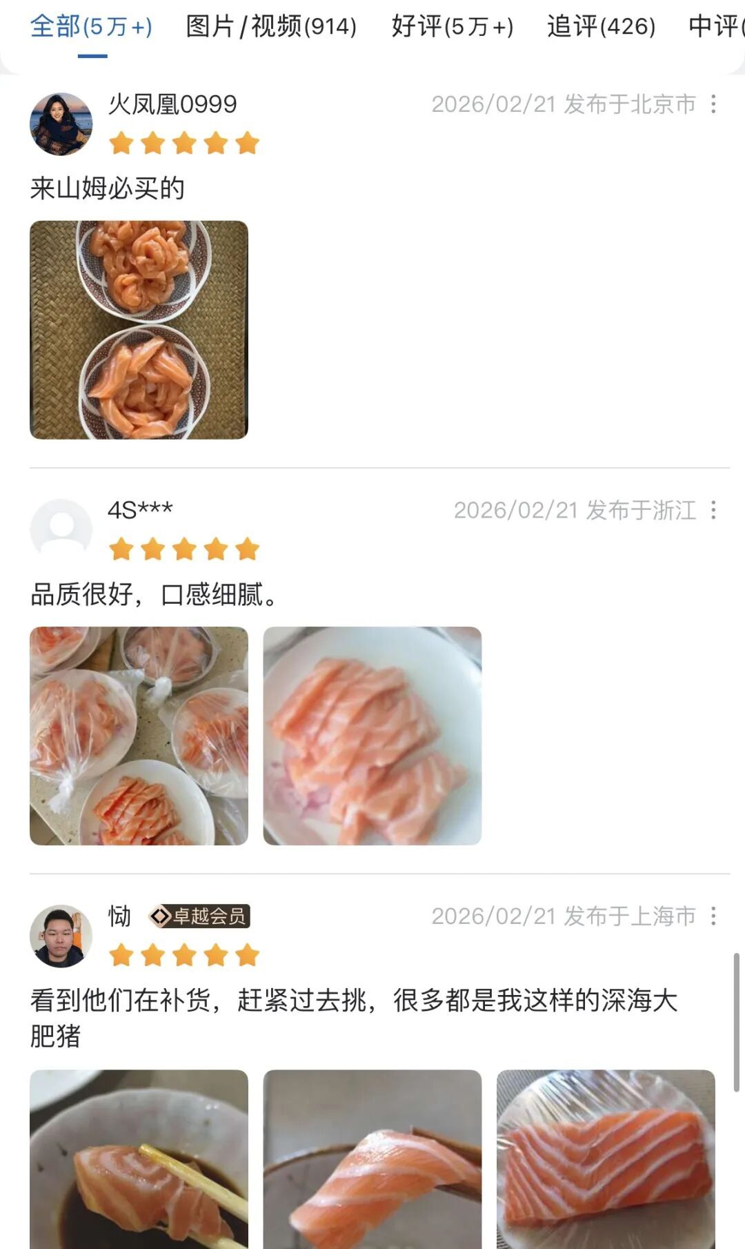 然而,翻开山姆网购App,找到这同款三文鱼之后,却可以在评论区看到,很多消费者买回去后都是生吃的,且上传了不少生吃的照片:
