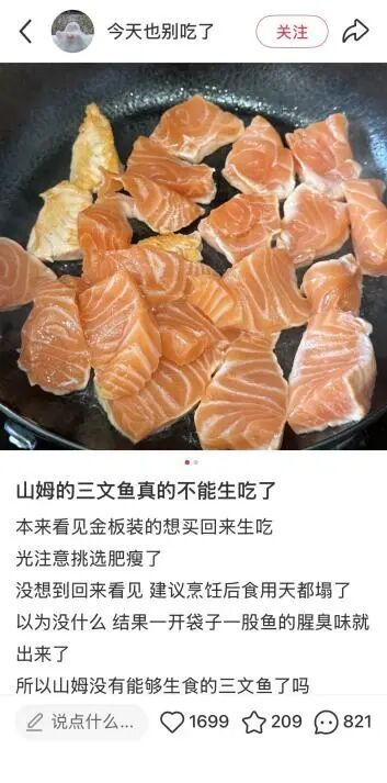 在小红书上,你能看到很多博主买了这款三文鱼,切成刺身薄片品尝,抑或用凉拌汁简单调味生食。但也有不少博主指出:其实这款三文鱼,是“不建议生食”的。