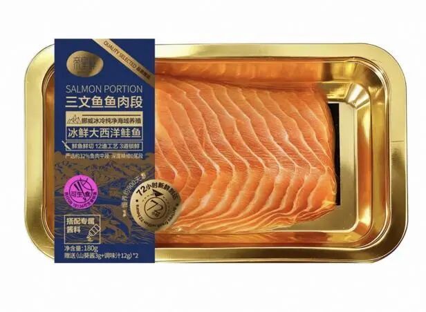 第一,这款三文鱼采用了可生食级三文鱼常见的金板塑封包装。相似的包装,在盒马超市有,在叮咚超市也有,而盒马与叮咚如此包装的三文鱼都是可以生吃的,仔细看包装背面,写的标准都是GB 10136。透明塑封膜加上金色底托,这种包装传递给消费者的第一个信号就是:我很新鲜,我适合生吃。